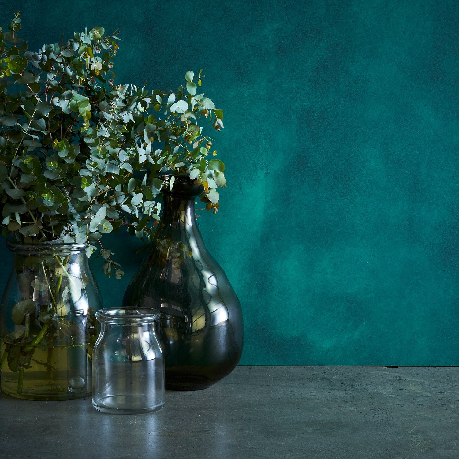 French Wash in Old Havana, a very dark navy, brushed and ragged over a base of Cuban Turquoise, a strong aqua green. In combination they create a deep, rich forest green.